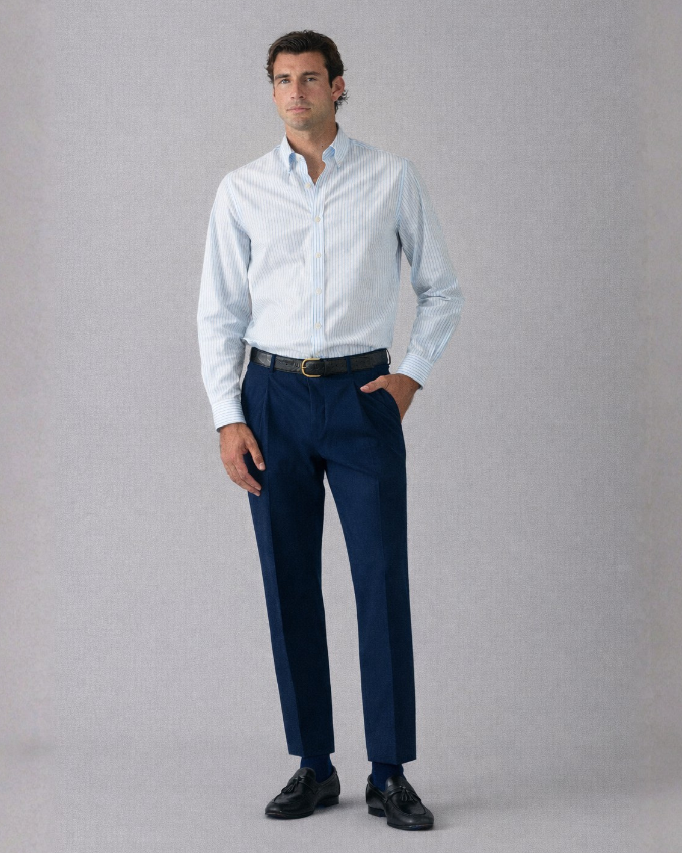 A cool and casual dress shirt for the office & handling your business after. Soft, durable & lightweight men's dress shirting fabric handcrafted from the oldest fabric mill in Portugal. A custom pattern designed in New York.