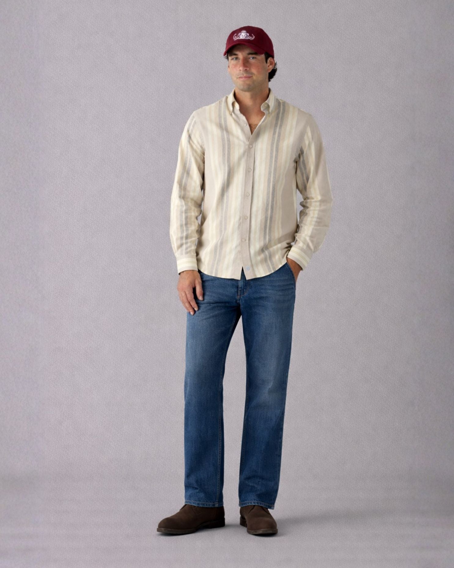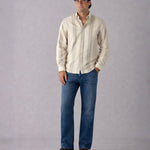 Extra soft & extra lightweight brushed cotton cream flannel shirt in a custom vertical stripe design. Perfect for your elegant & festive Fall/Winter attire. Sourced from Portugal's oldest shirting mill.
