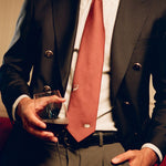 100% Shappe Silk Tie in rich burgundy. Handcrafted in Lake Como, Italy. Enjoying the simple pleasures of a sharing a bottle of wine with another on a beautiful evening. All you need is a "Table for Two".