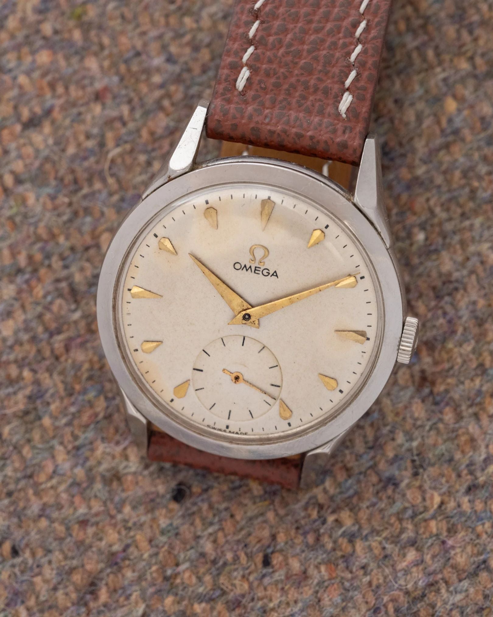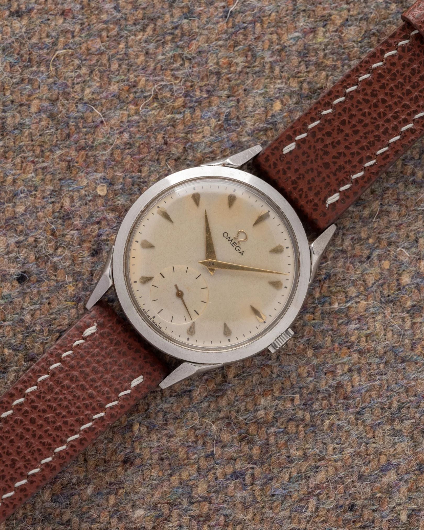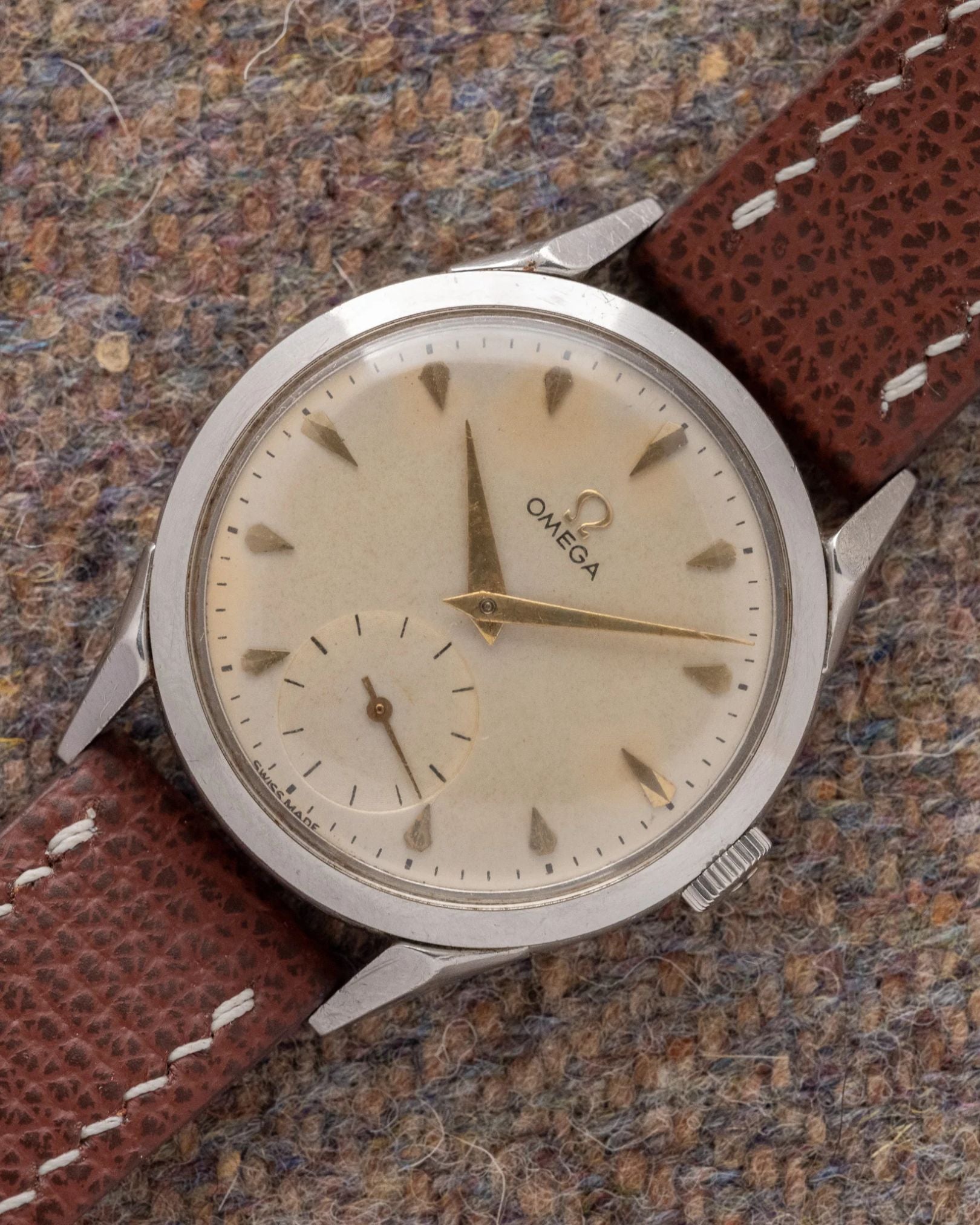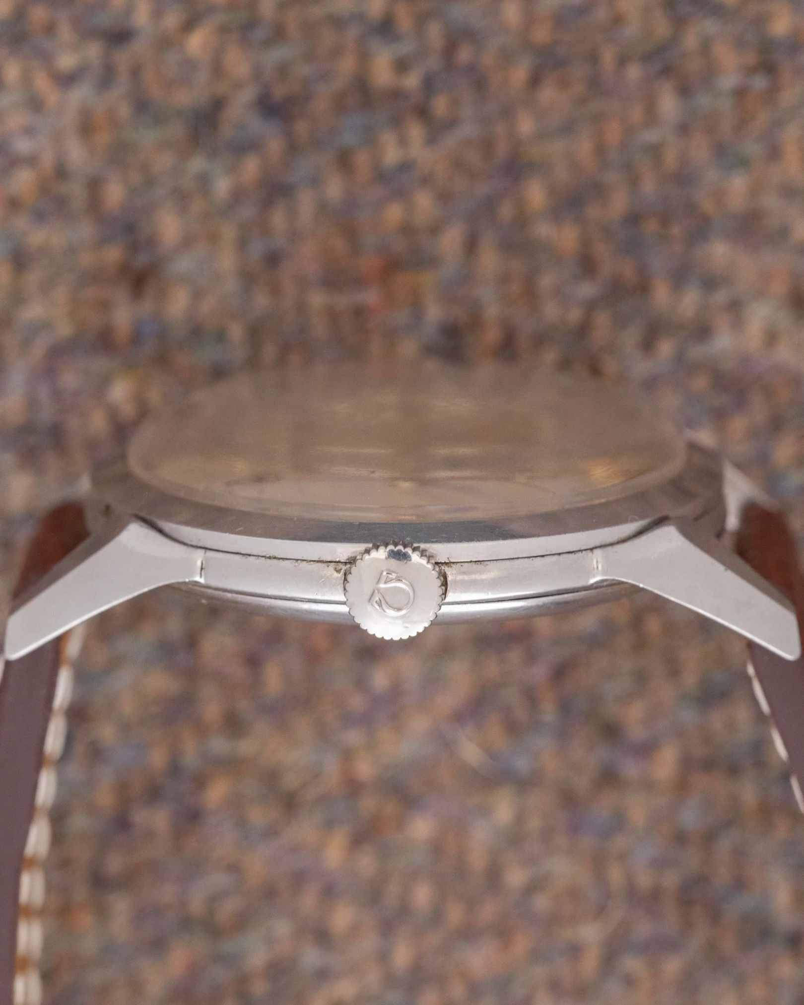 EXCLUSIVE AT LE ALFRÉ A special vintage Omega from 1952 with an original Omega-signed crown and unique jumbo spider lugs. A warm patina dial and manual movement, you'll feel like you're wearing your grandpa's timepiece.