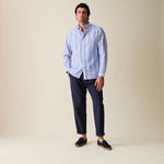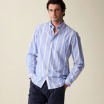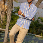 Our Marina Blue Wide Stripe Summer Chambray Shirt. A vintage inspired style designed in a cool and modern way made with a super lightweight, airy summer chambray fabric. It won't feel like you're wearing a shirt at all.
