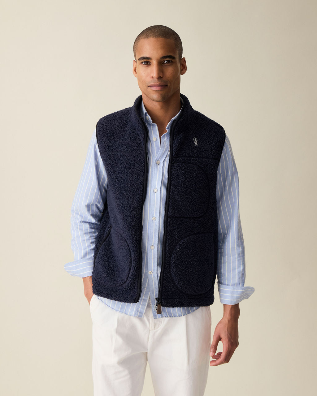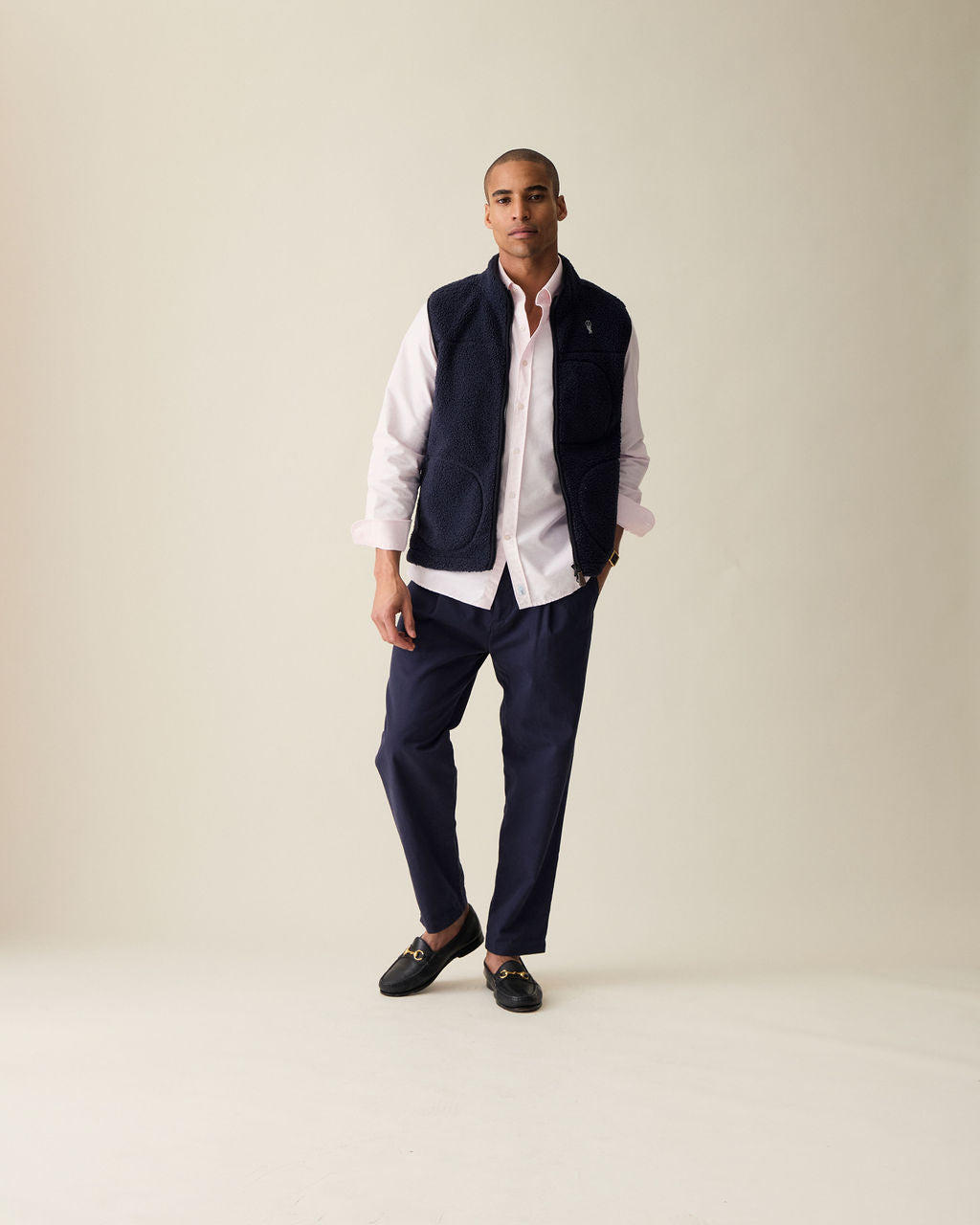 Crafted with soft fleece, this gilet offers supreme comfort and exceptional warmth, making it the ideal choice for the cold. Our Portuguese fleece provides coziness without the bulk, ensuring you stay comfortable in effortless style. This gilet combines a polished look with a unique, sporty design that seamlessly complements both your office attire and your weekend wardrobe. It's the perfect blend of classic elegance and cool edge that will set you a part from the rest.