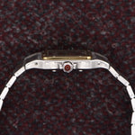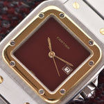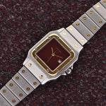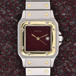 EXCLUSIVE AT LE ALFRÉ in collaboration with verified vintage watch dealer, Huntington Company. The luxurious style of the 80s. A beautiful unique watch from the iconic Santos family. The sought-after burgundy wine dial has ver even spidering. The case and bracelet have signs of a light polish but still shows the original case lines. The watch is confirmed and comes with correct ruby cabochon. Sold in partnership with Huntington Company, an exclusive partner of vintage watches located in Virginia.