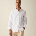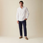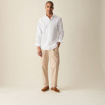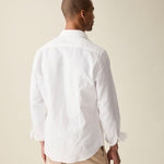 This cotton-linen blend shirt runs slightly slimmer and more fitted than our oxford shirts. If you are in between sizes, please size up.