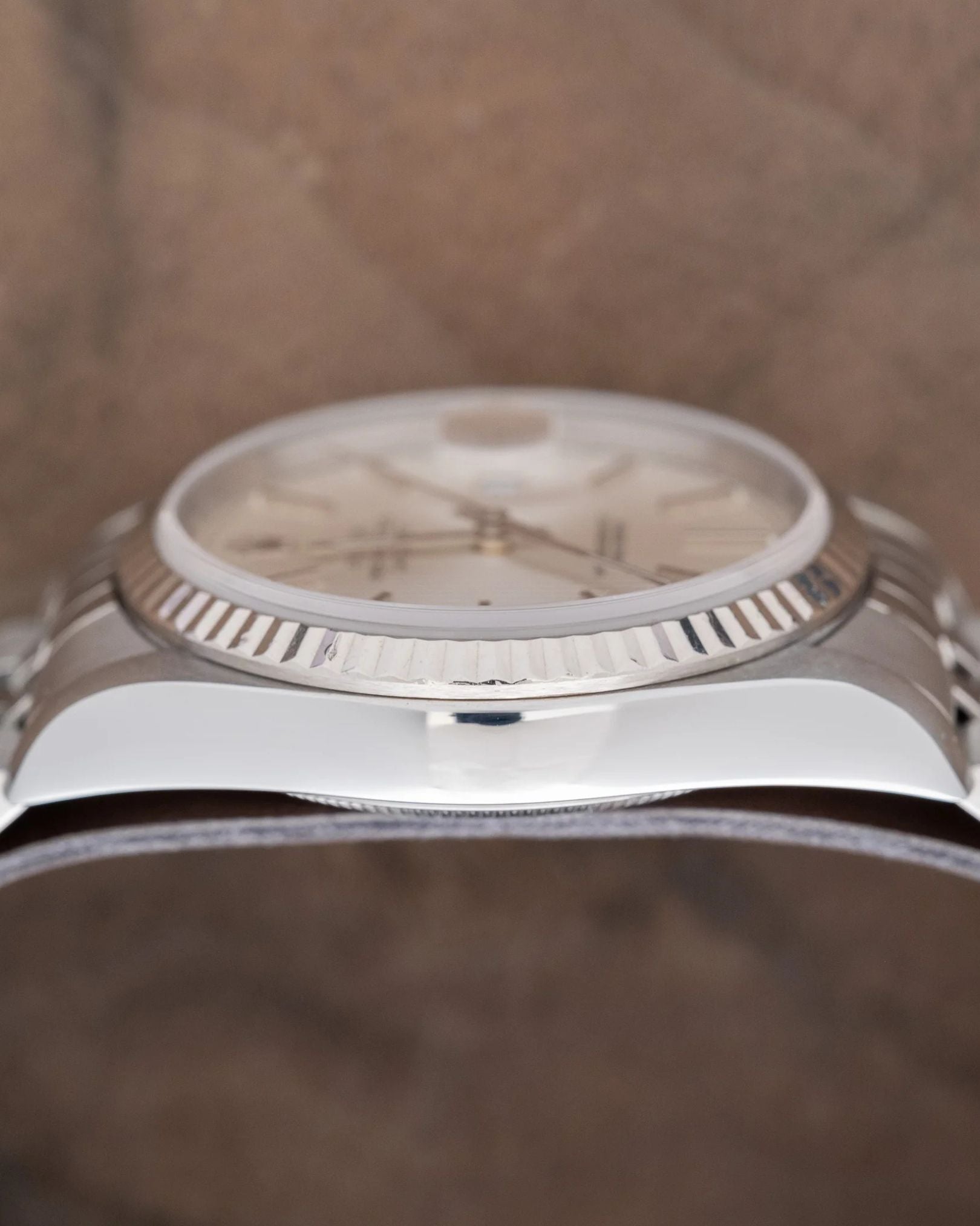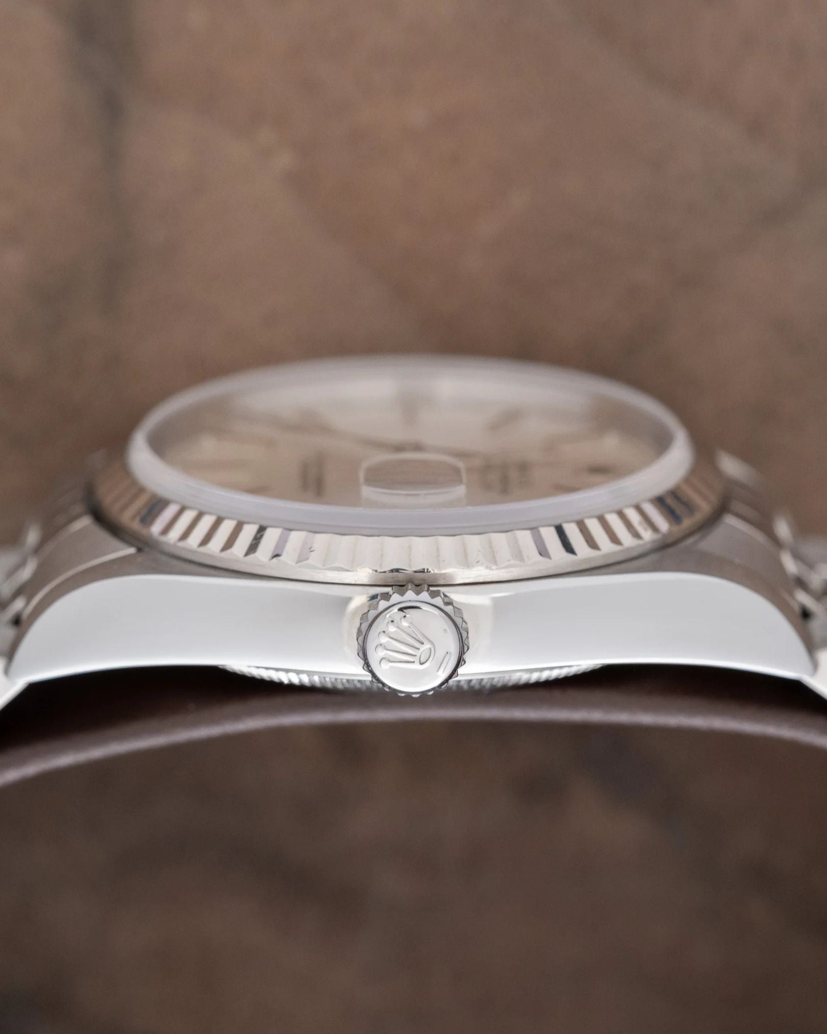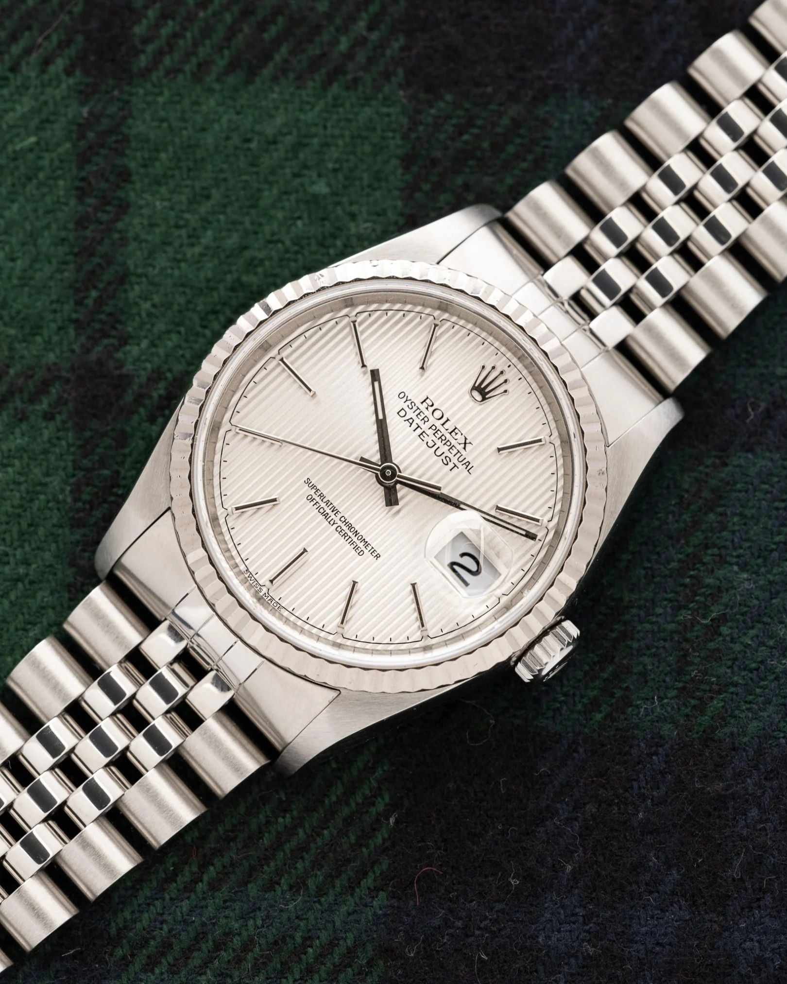EXCLUSIVE AT LE ALFRÉ This is a beautiful silver 2000 Rolex Datejust watch with a unique white tapestry dial. The Rolex Datejust, introduced in 1945, is one of Rolex's oldest collections of watches. It was the world's first self-winding wristwatch with a date window that automatically changed over at midnight.