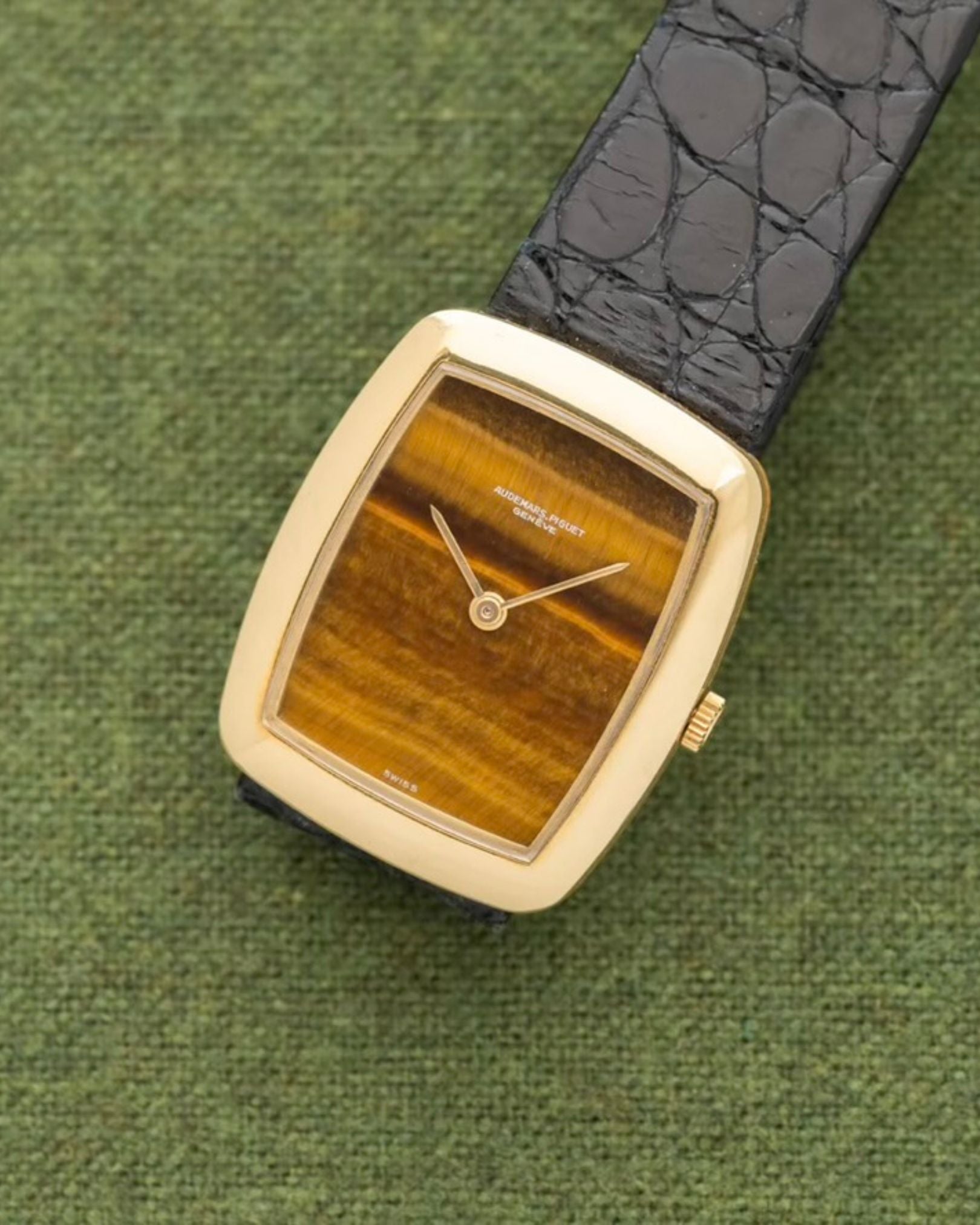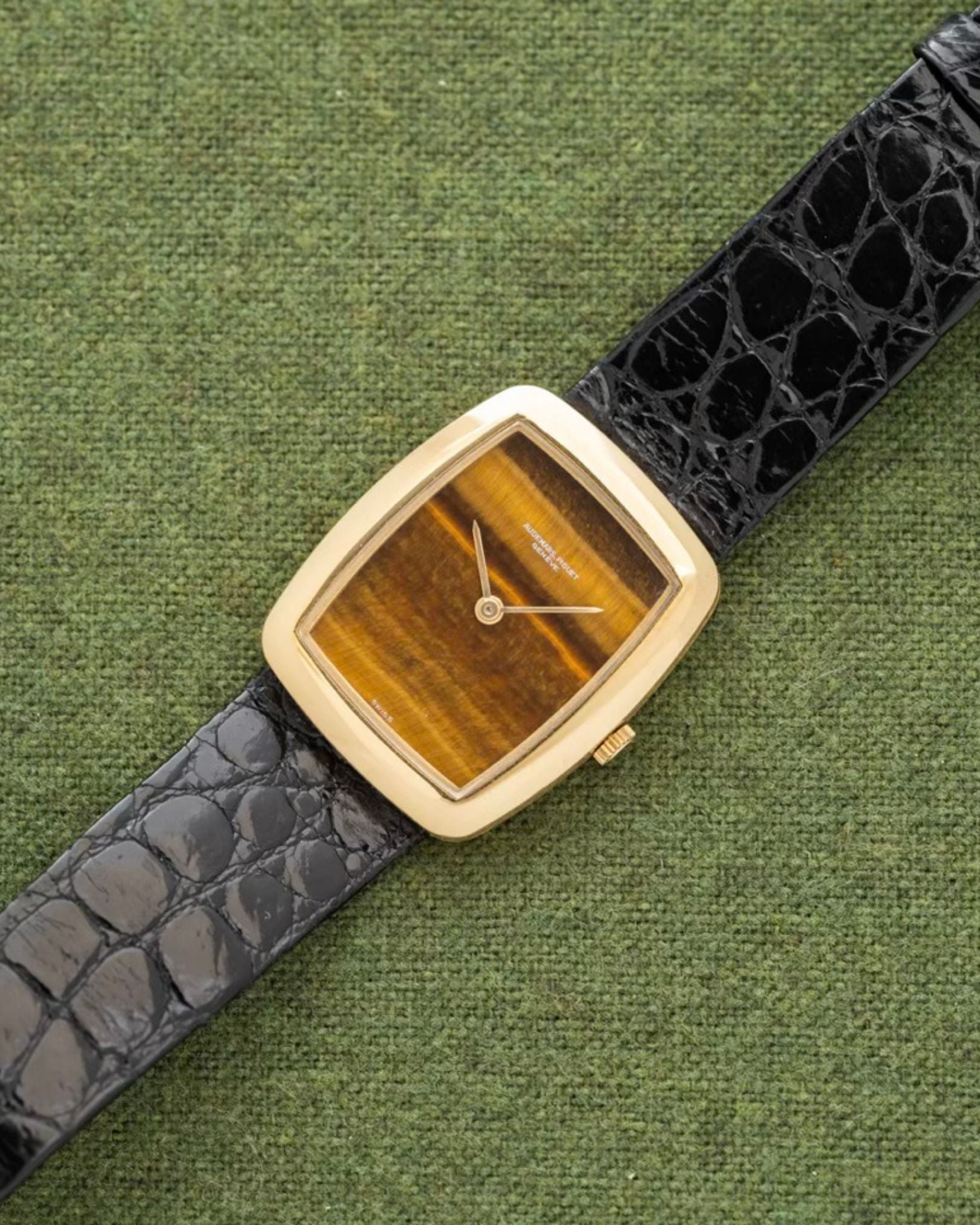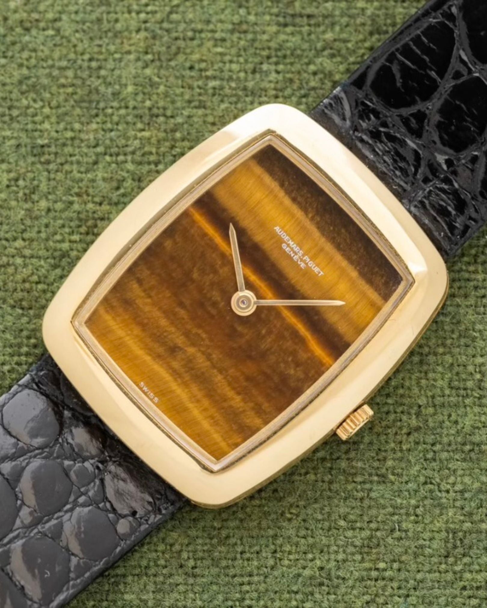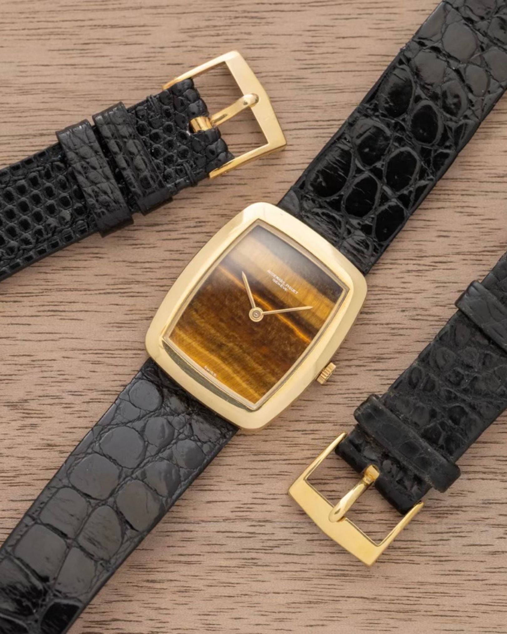 EXCLUSIVE AT LE ALFRÉ This is a clean black & gold Audemars Piguet Tigers Eye Stone. A timeless piece from the 1970s, this Swiss-made watch is a simple & elegant addition to any occasion.