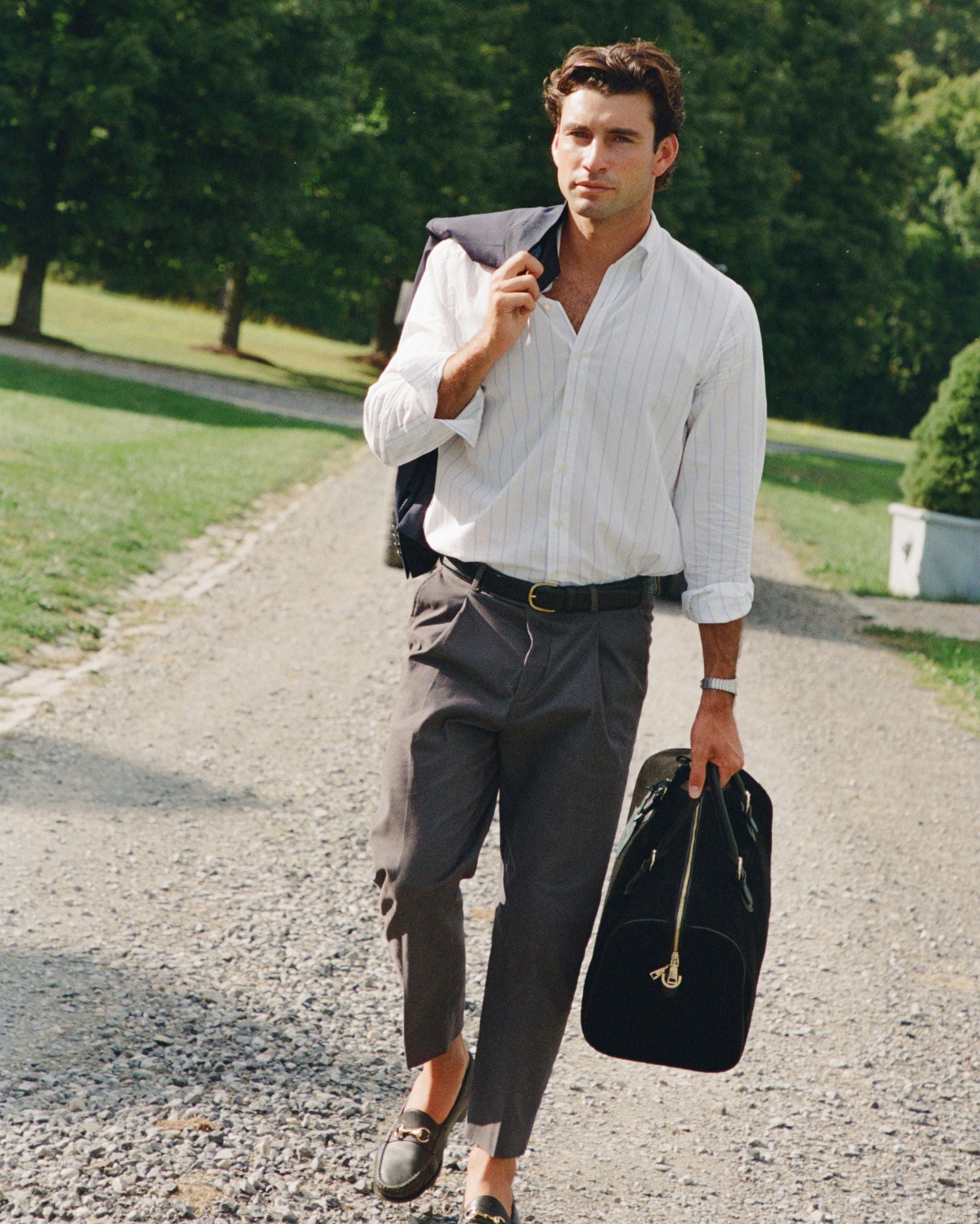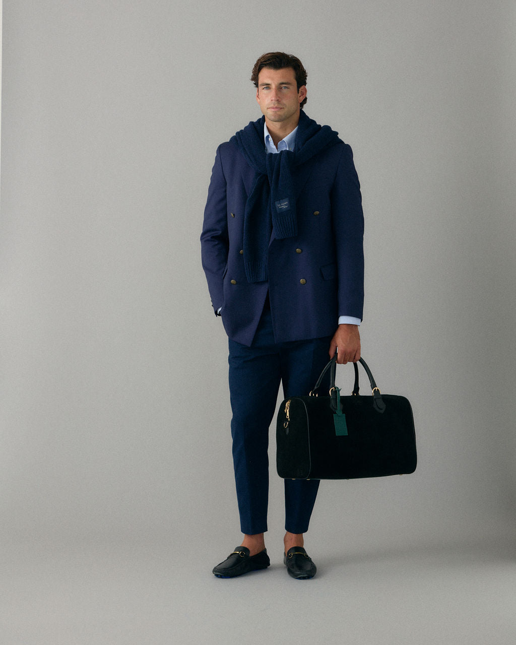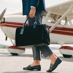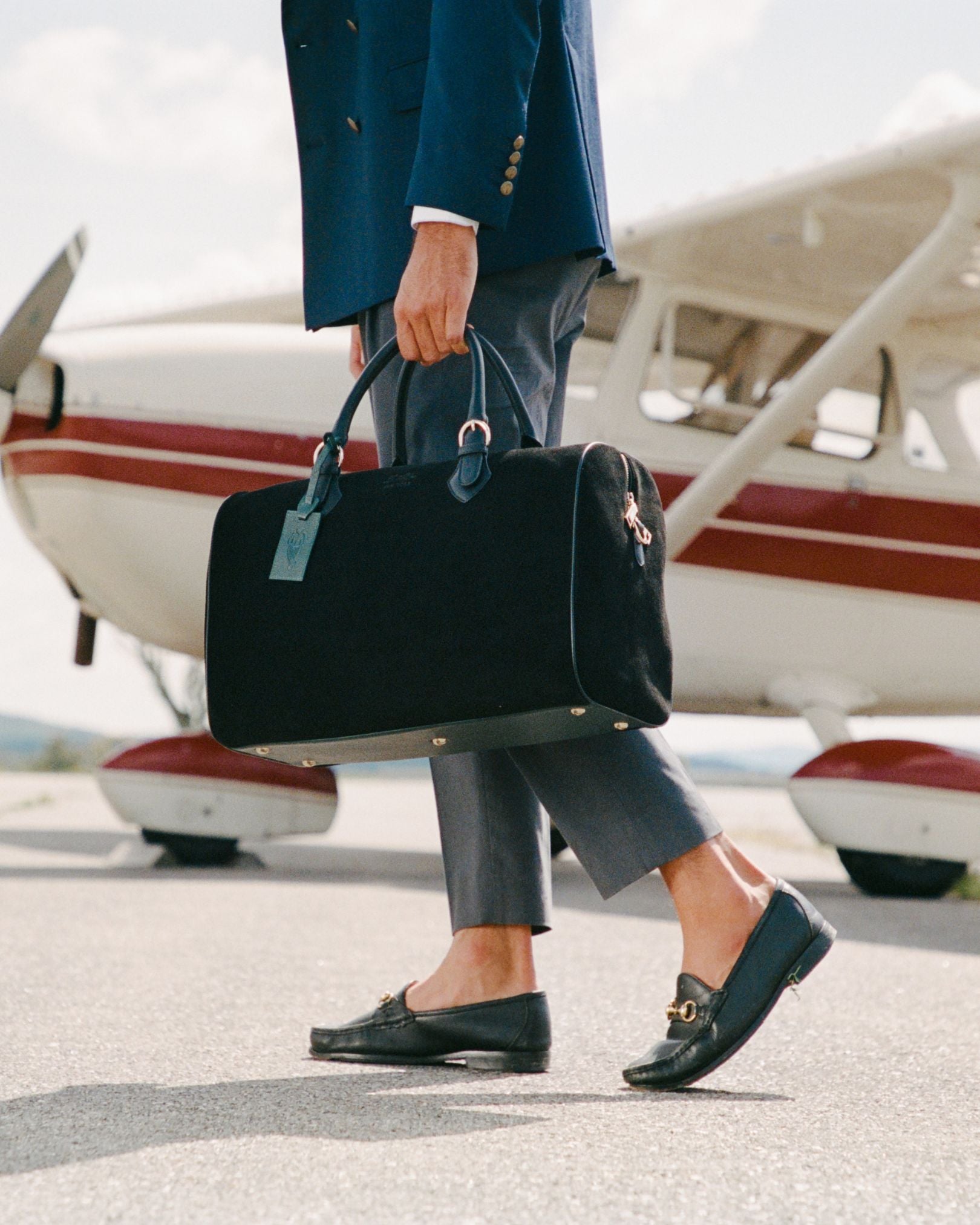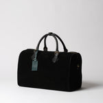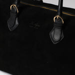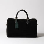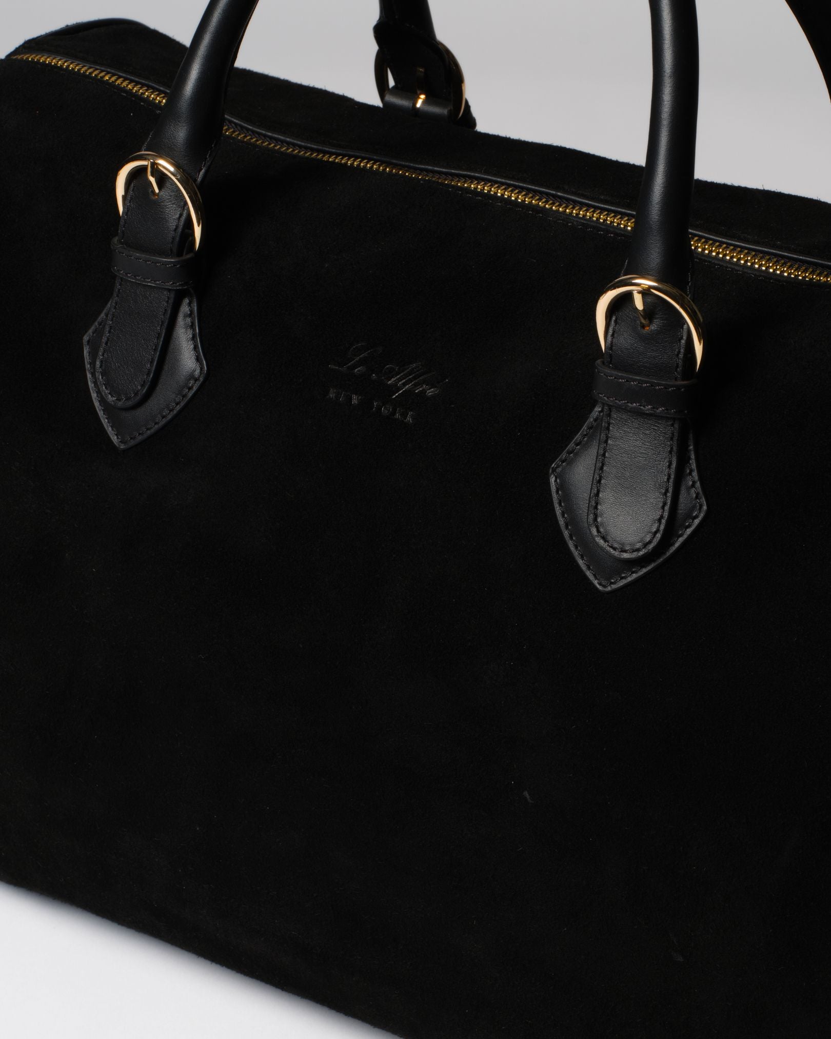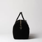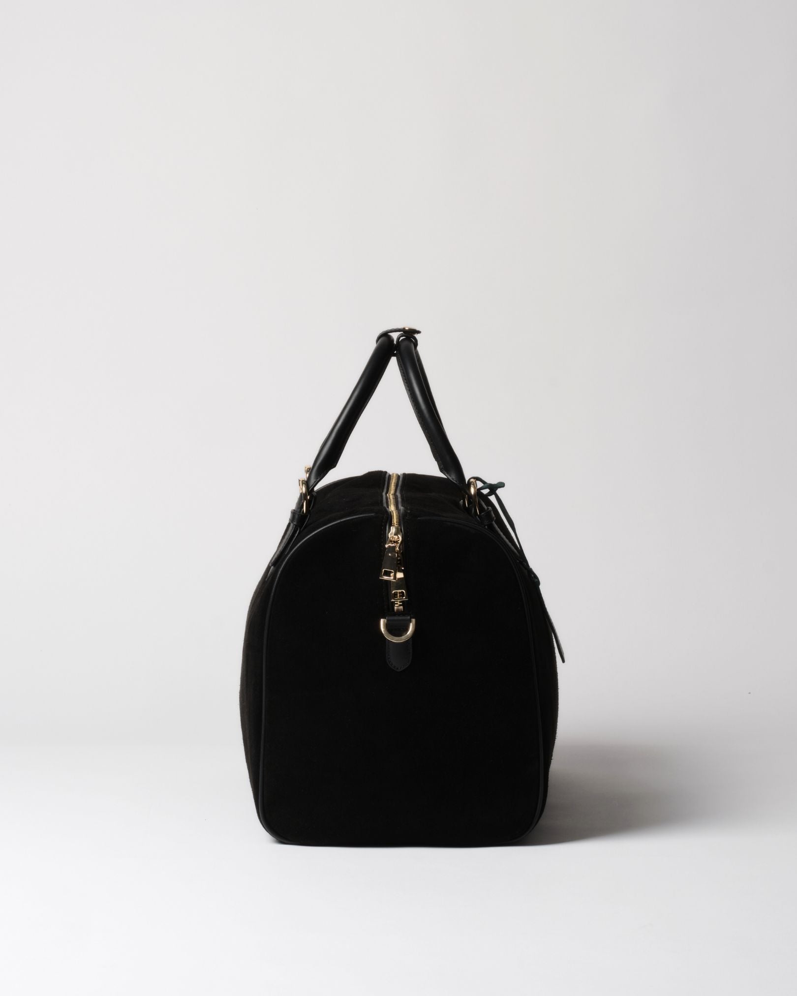 100% suede weekender bag in black. Black leather handles & adjustable shoulder strap with plated gold buckles. Sleek & elegant carry on travel bag for your getaways around the world.