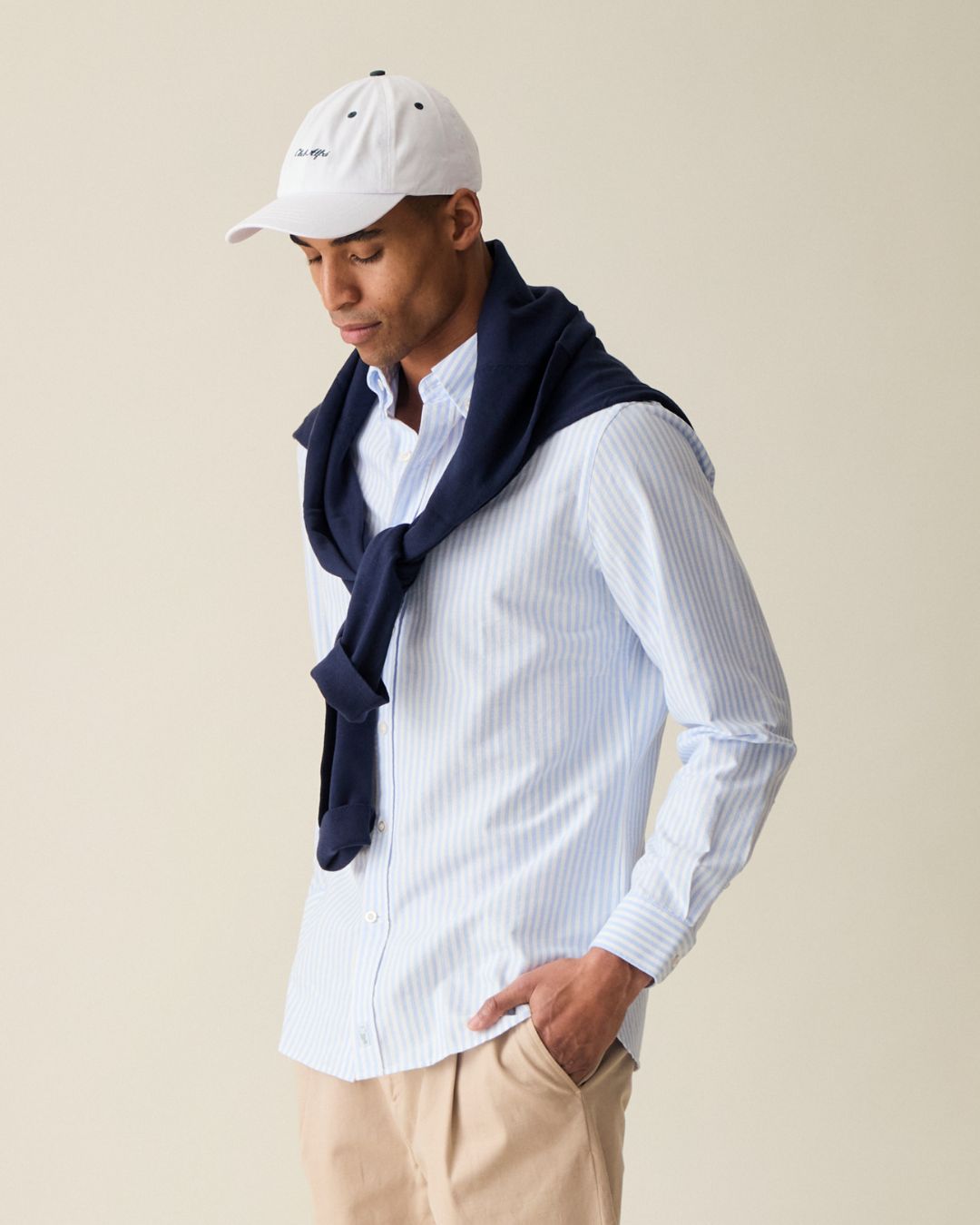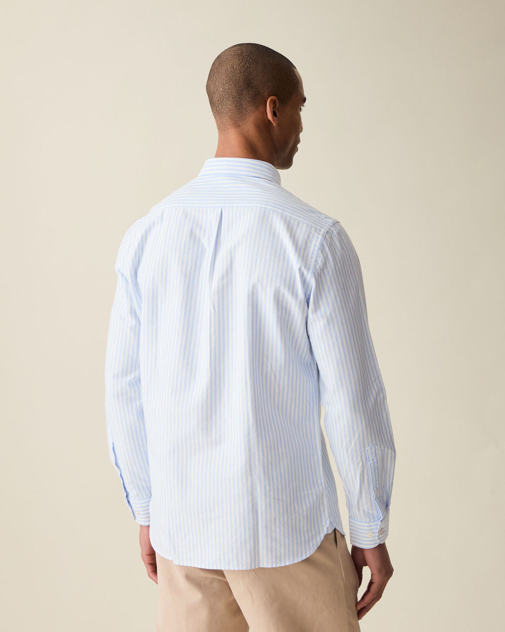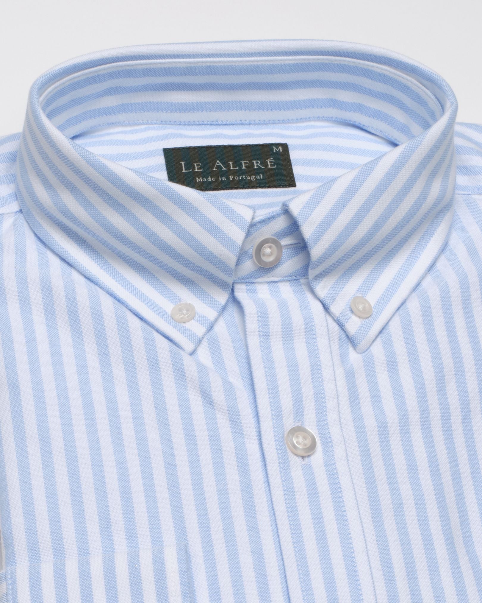 Our classic Oxford Shirt with wider white and light blue stripes. A sophisticated look with a gentle colorway perfect for Spring. Handcrafted with beautiful Portuguese fabric.