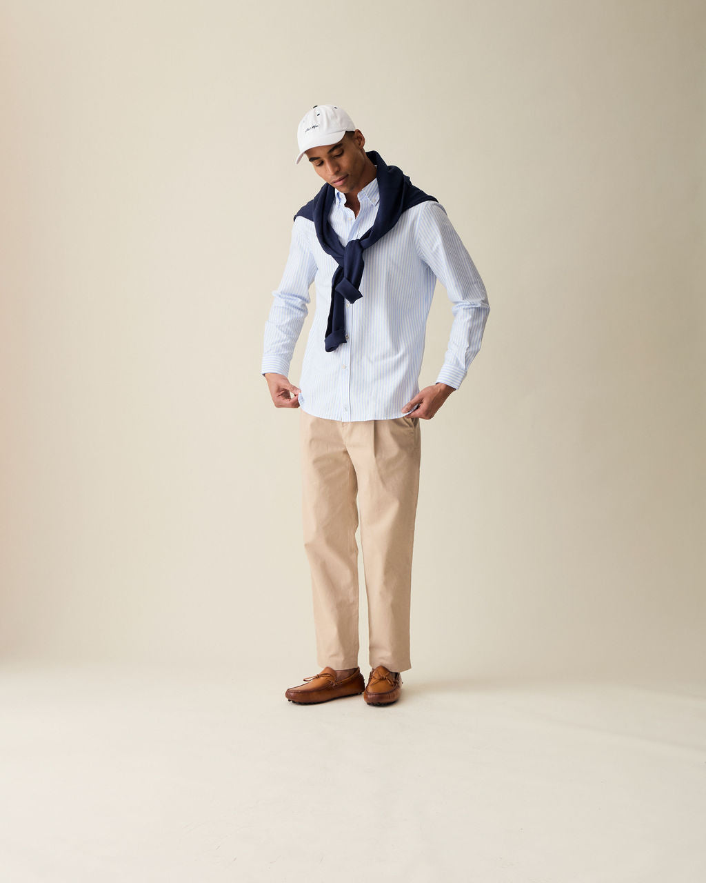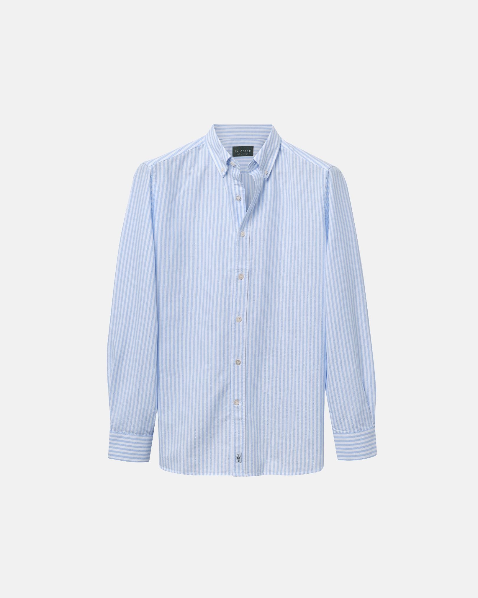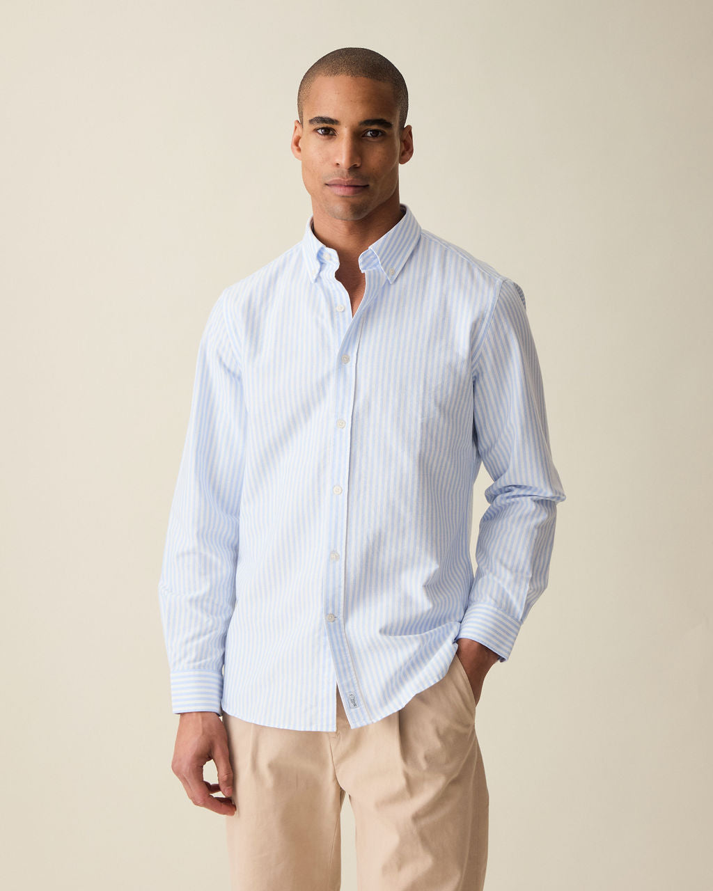 Our classic Oxford Shirt with wider white and light blue stripes. A sophisticated look with a gentle colorway perfect for Spring. Handcrafted with beautiful Portuguese fabric.