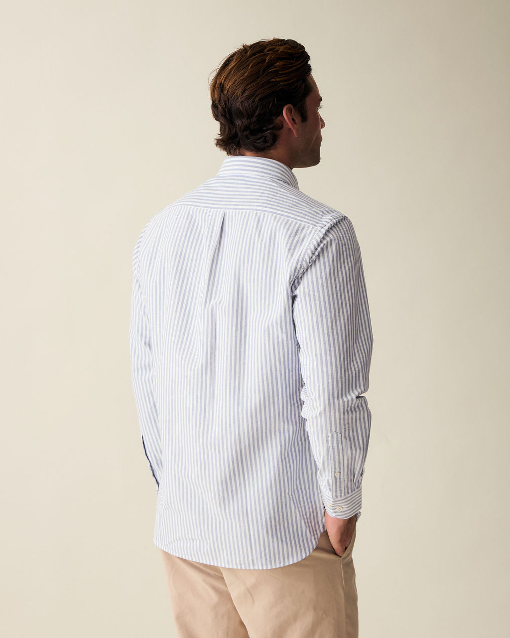 Our classic Oxford Shirt with wide navy stripes. A beautifully designed shirt that will get you feeling stylish for Spring. Handcrafted with beautiful Portuguese fabric.