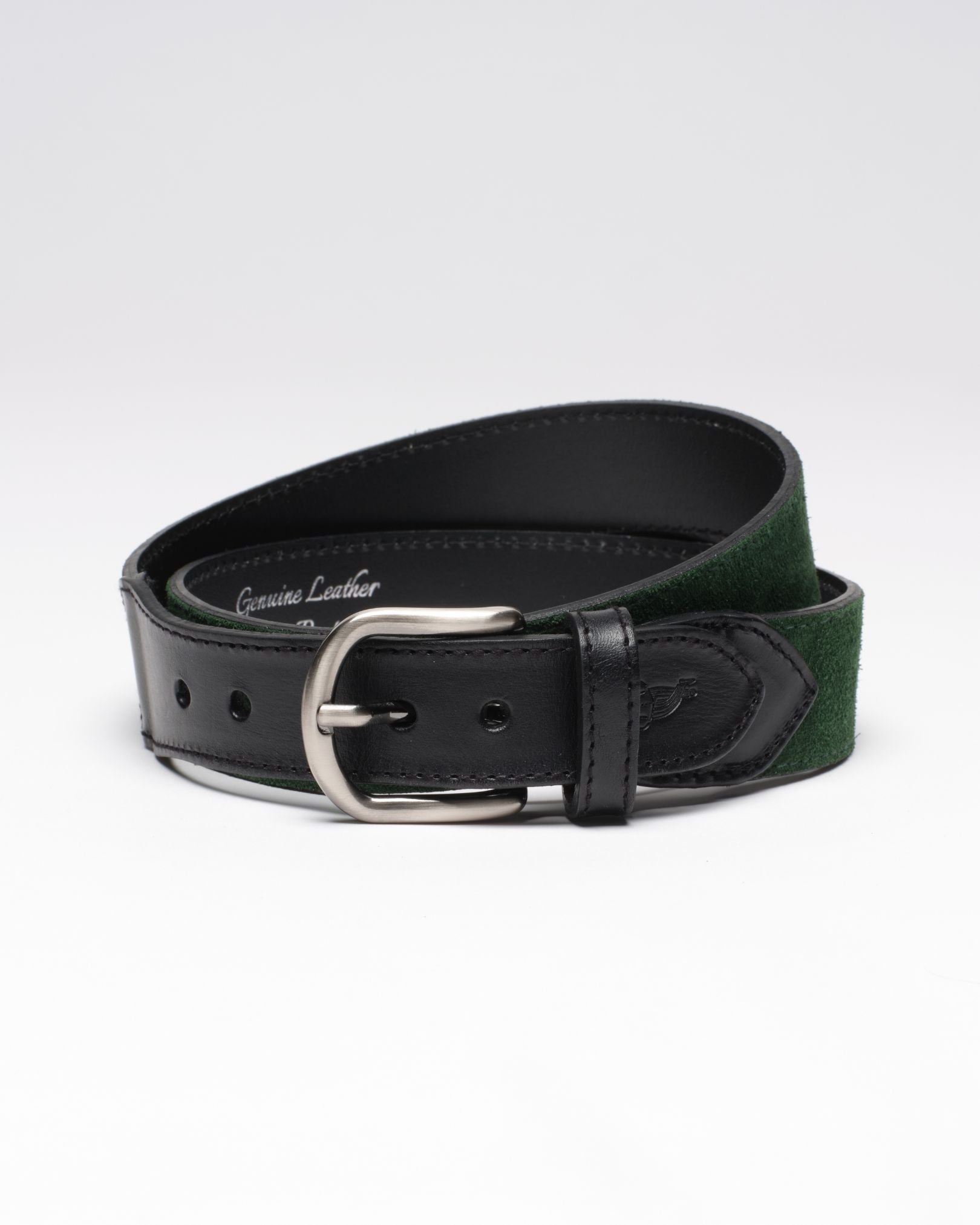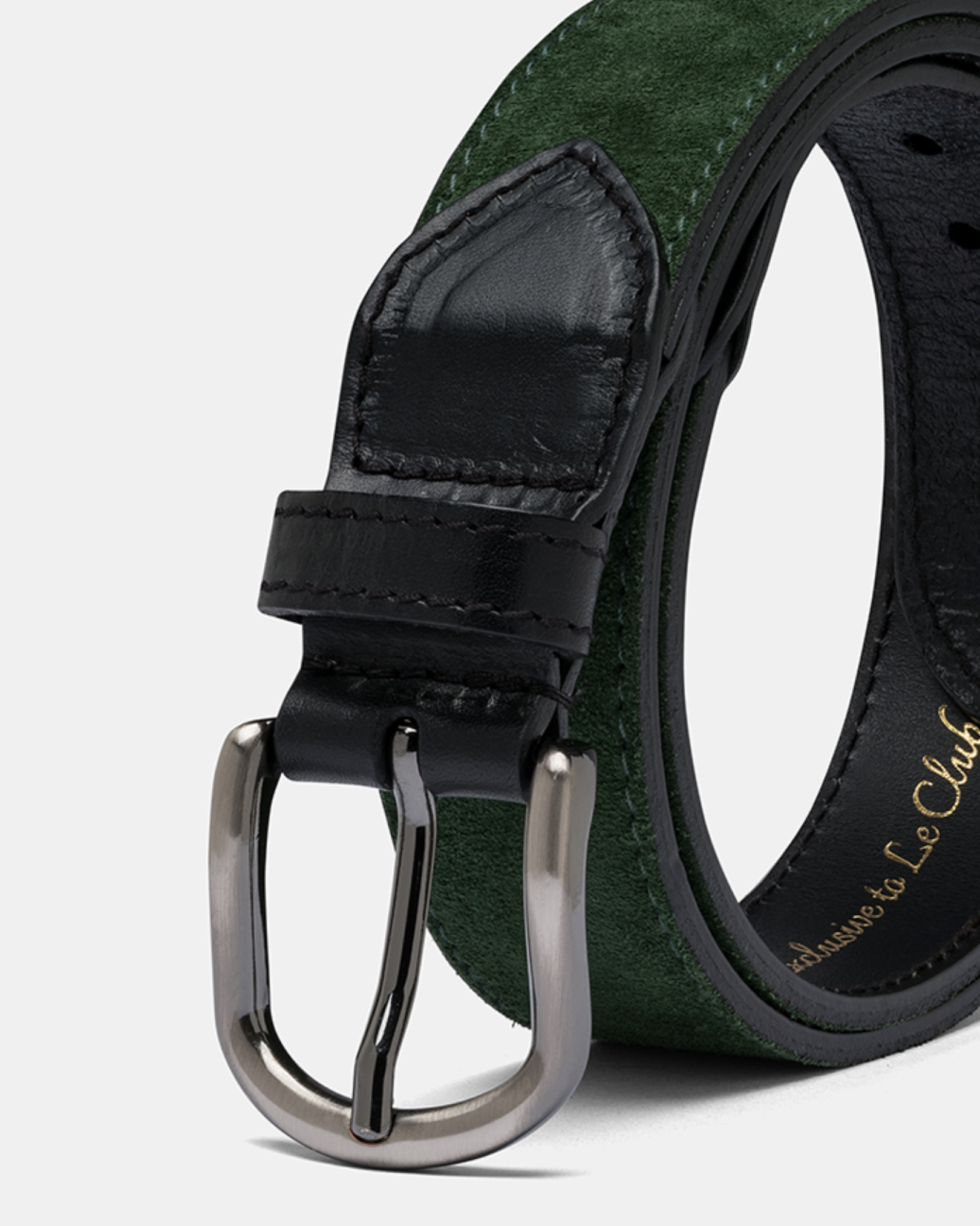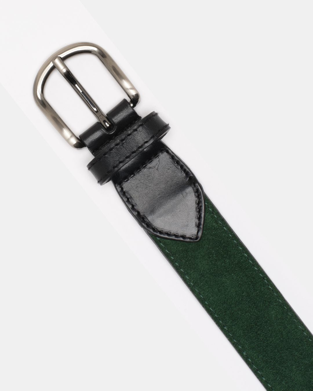 Made in Portugal from real, Portuguese leather, this beautiful hunter green suede belt combines cool & elegance in a unique design. Featuring hunter green suede, black leather, chrome silver buckle & custom trims.