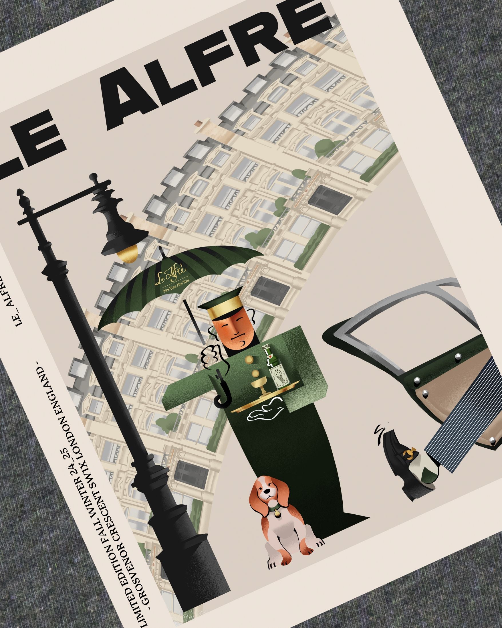 Inspired by Alfré's recent travels to England. This tee depicts the life of British aristocracy with a playful Art Deco inspired illustration of "A Royal Welcome". After a long day of work at the Canary Wharf office, Alfré is welcomed by his butler &  English beagle at his modest Grosvenor Crescent mansion.