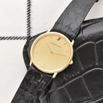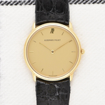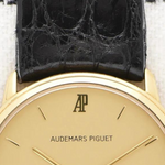 EXCLUSIVE AT LE ALFRÉ in collaboration with verified vintage watch dealer, Huntington Company. This is a beautiful gold Audemars Piguet Classic Ultra watch from the 1990's. This piece is in excellent condition and combines elegance with simplicity. Patrick Bateman wished he had this watch. Sold in partnership with Huntington Company, our Vintage Watch Dealer located in Huntington, Virginia.