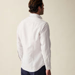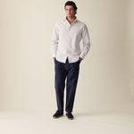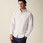 This cotton-linen blend shirt runs slightly slimmer and more fitted than our oxford shirts. If you are in between sizes, please size up.