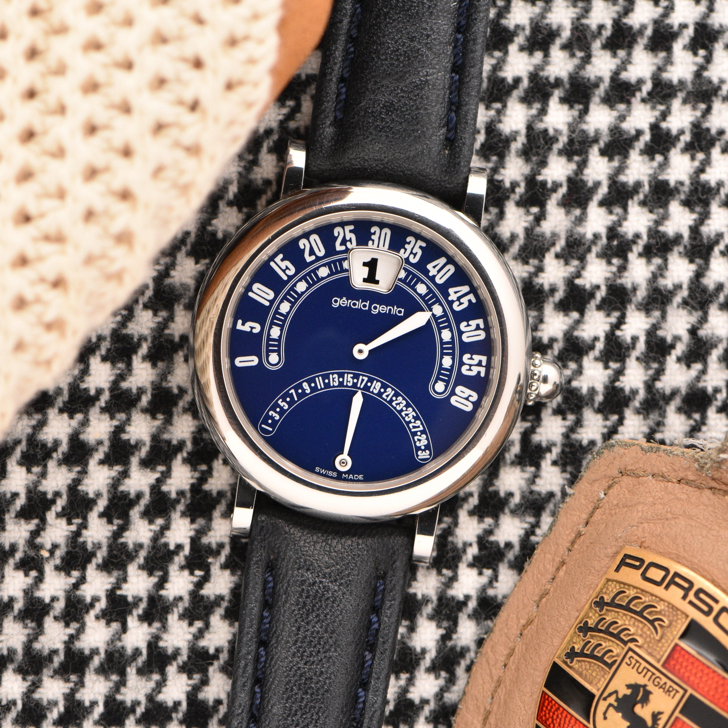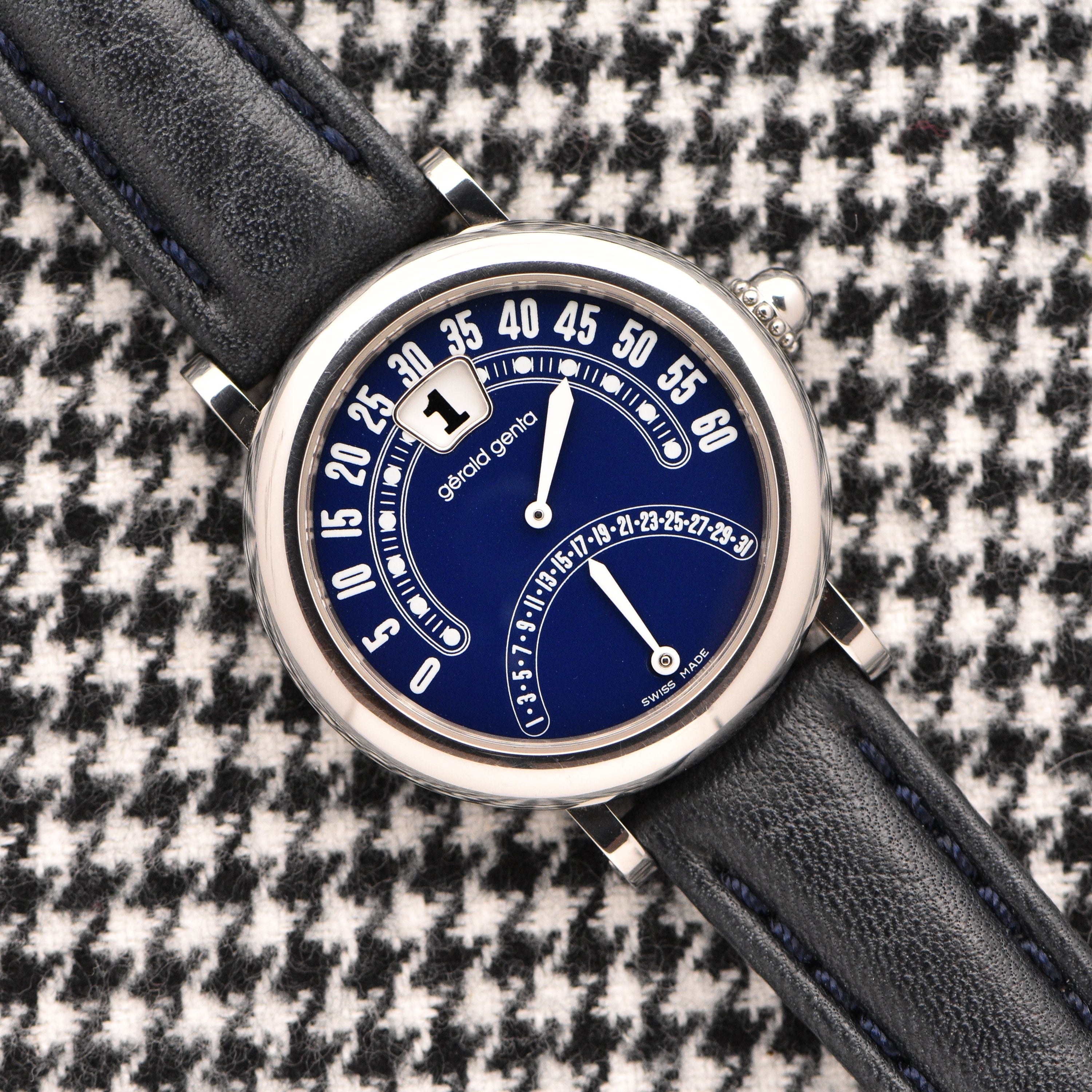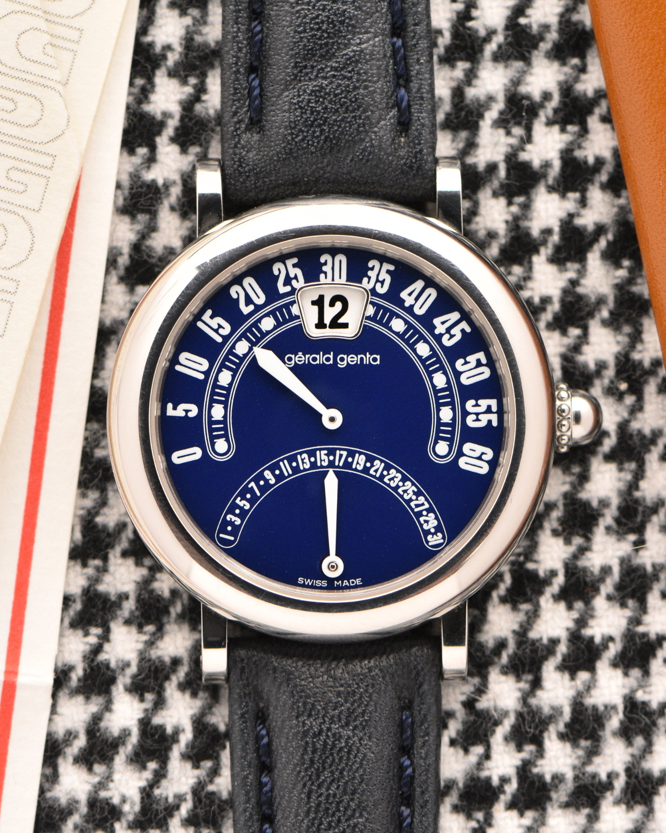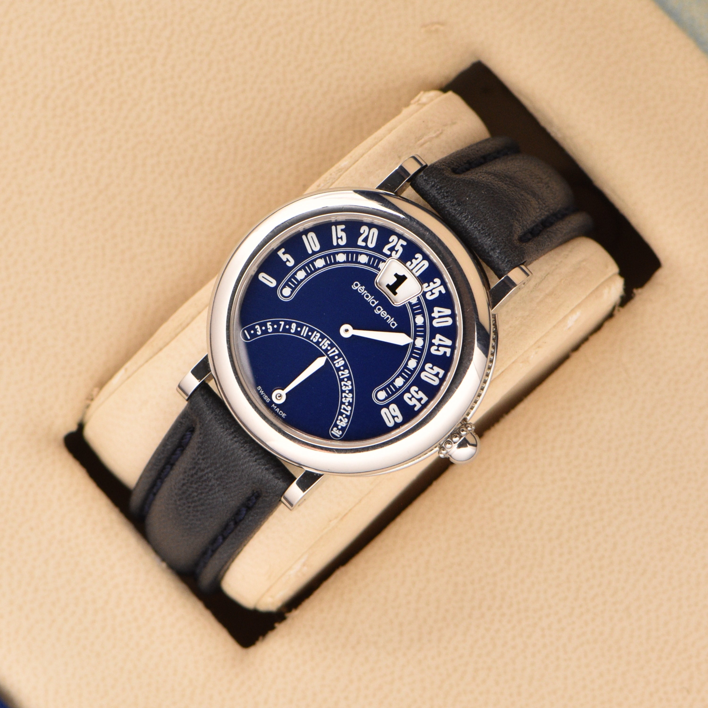 EXCLUSIVE AT LE ALFRÉ in collaboration with our good friends & verified vintage watch dealer, Huntington Company. This specific timepiece isn't an easy model to find, especially with its original box and papers. The creator, Gérald Genta, a Swiss watch maker extraordinaire and artist who designed the iconic Omega Constellation, Audemars Piguet's Royal Oak & the infamous Nautilus from Patek Phillippe, was deeply involved in the mechanics of his timepieces from his early days at Universal Geneve. He introduced the retrograde minute, a jump hour movement, and later a retrograde date, which redefined the way time is displayed on a watch. The blue dial is amazing, it's the perfect shade of royal blue. The white hands and numbers make the watch very easy to read. Paired with the original blue box, you have an amazing set. Sold in partnership with Huntington Company, an exclusive partner of vintage watches located in Virginia.