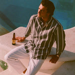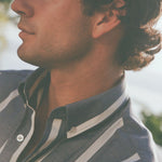 Our Navy Wide Stripe Summer Chambray Shirt. A vintage inspired style designed in a cool and modern way made with a super lightweight, airy summer chambray fabric. It won't feel like you're wearing a shirt at all.