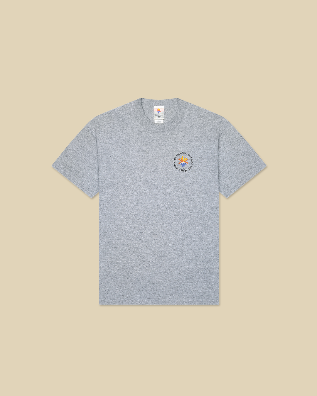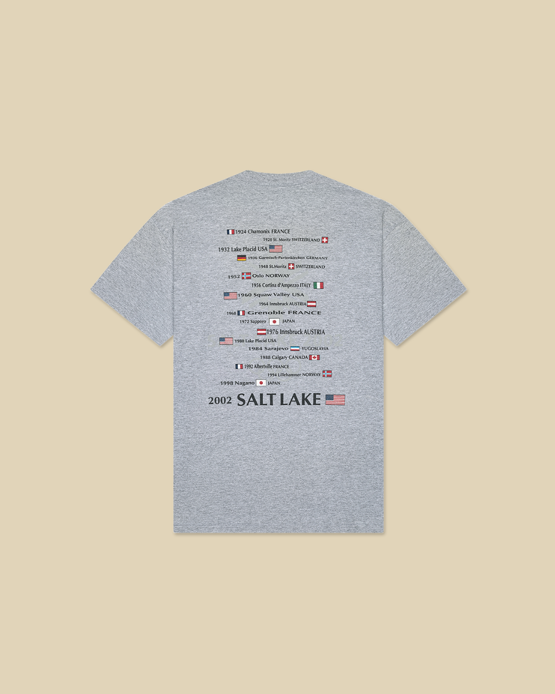 EXCLUSIVE AT LE ALFRÉ. Nothing says Winter like the Winter Olympics. This rare vintage graphic tee commemorates the Salt Lake City 2002 Winter Olympic Games with past locations around the world going back to the very first held in Chamonix, France (1924).