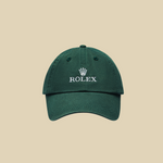 EXCLUSIVE AT LE ALFRÉ. This is a rare vintage Rolex forest green cap. This cap features a deep, rich green hue reminiscent of luxury and prestige, complemented by the iconic Rolex logo subtly embroidered across the front.